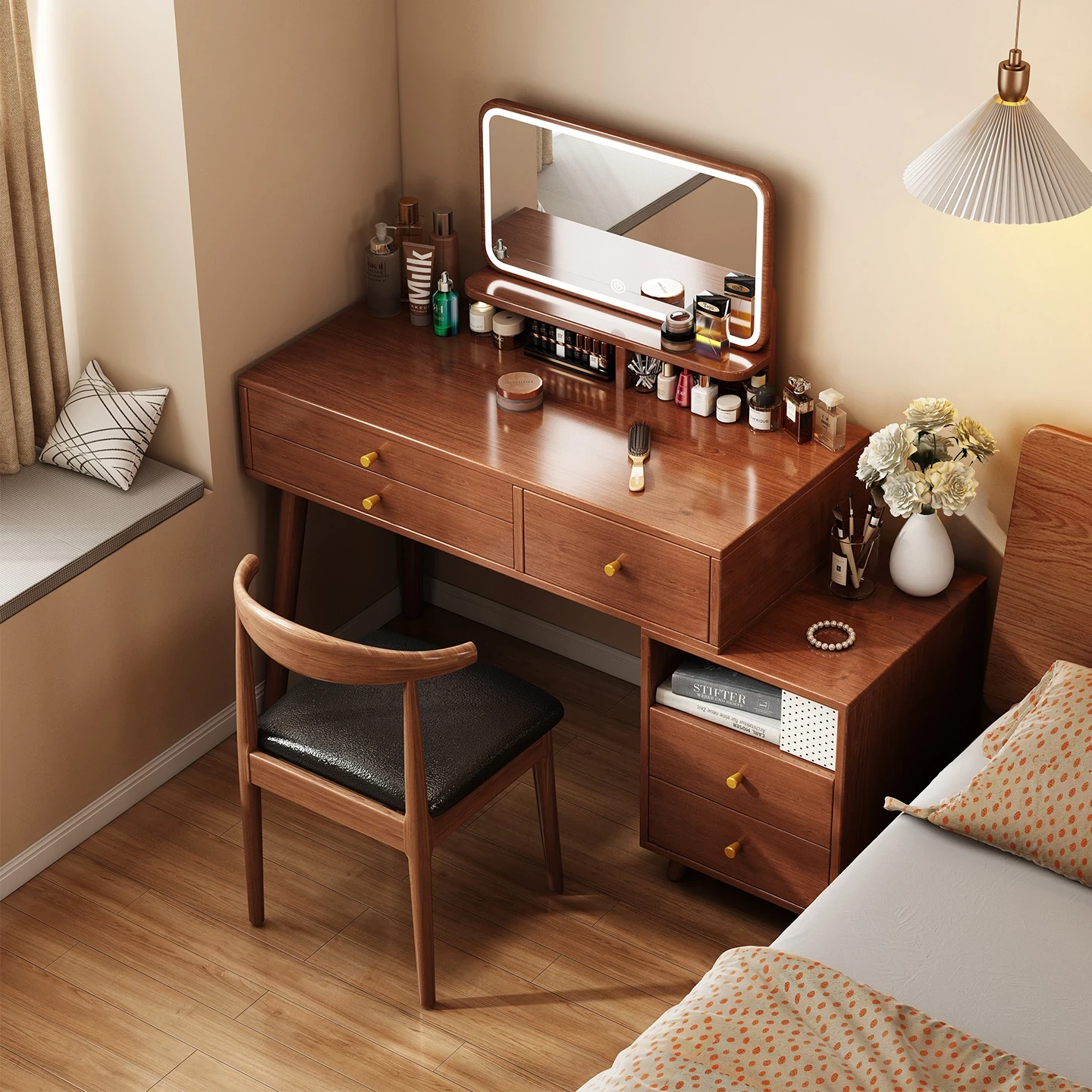 Compact Modern Makeup Vanity Table with Integrated Bookshelf – Perfect for Small Spaces and Stylish Bedrooms!