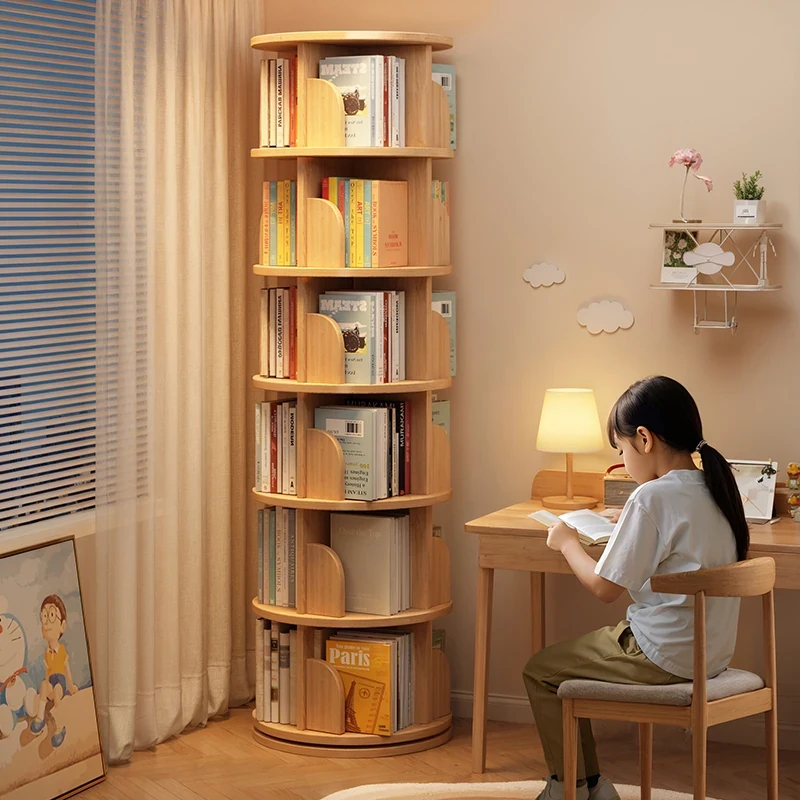 360-Degree Rotating Bookshelf - Solid Wood Floor-standing Storage Rack for Students' Picture Books - Stylish Corner Wall-mounted Bookcase for Living Room
