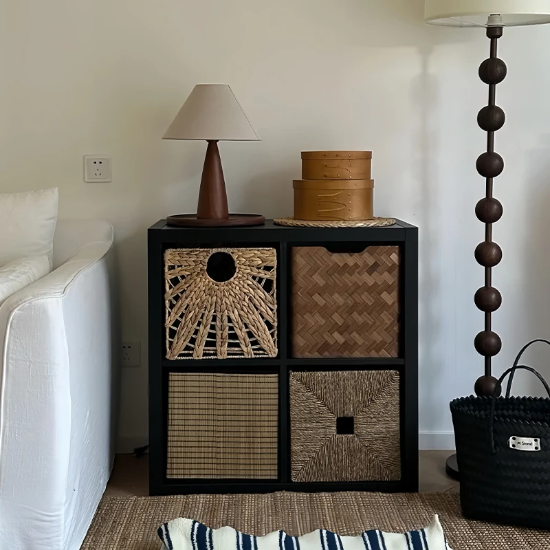 Vintage Black Plaid 4-Grid Cabinet - Stylish Living Room Side Table, Bookshelf, and Floor Storage Unit - Perfect for Sofa or Small Spaces