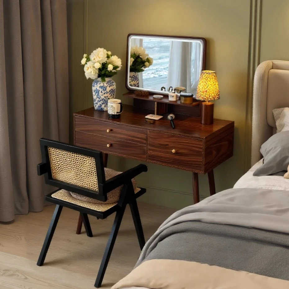 2025 New Retro Makeup Vanity & Nightstand - Compact Chinese-Style Bedroom Desk with Integrated Storage for Small Spaces