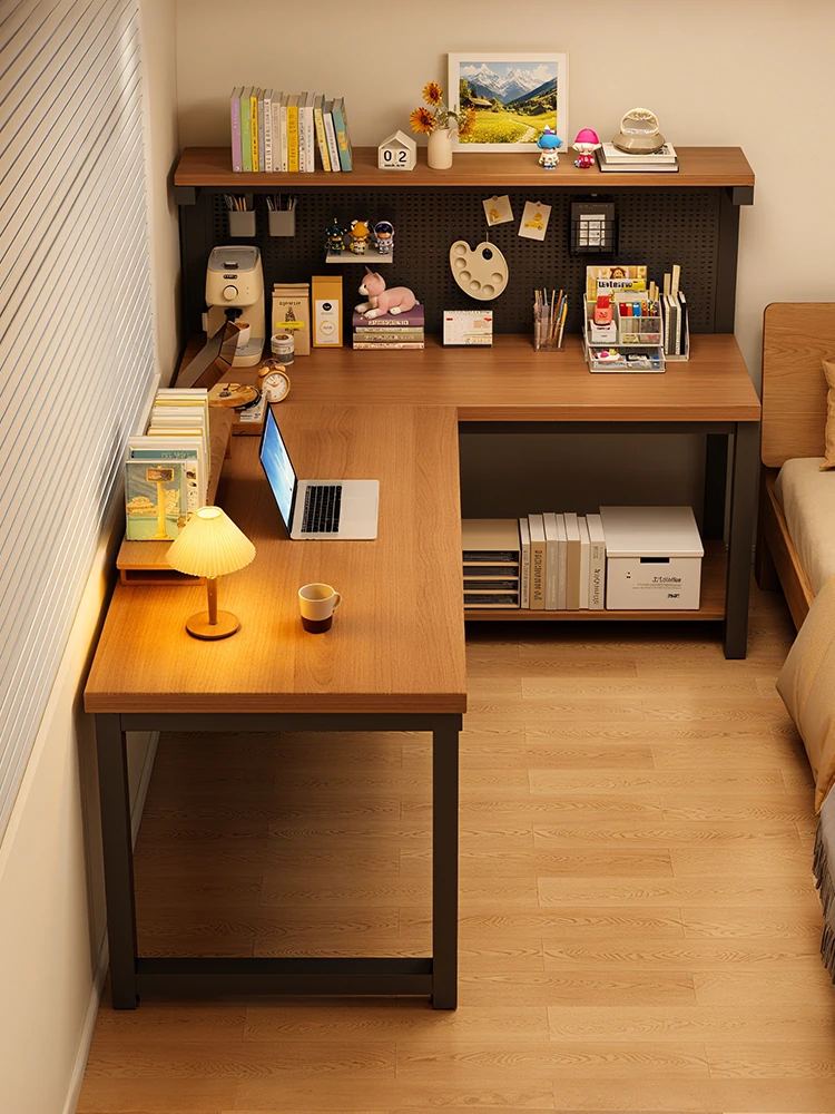 Solid Wood Corner Hole Board Desk and Bookshelf Combo - Ideal for Bedrooms, Students, and Home Offices - L-Shaped Computer Desk for Efficient Workspace Organization
