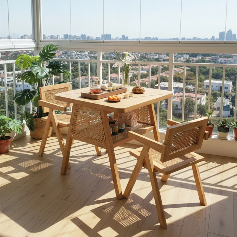 Stylish Solid Wood Tea Table for Balcony - Compact Square Tea Desk for Home, Living Room, and Courtyard - Elegant Rattan Chair and Table Set