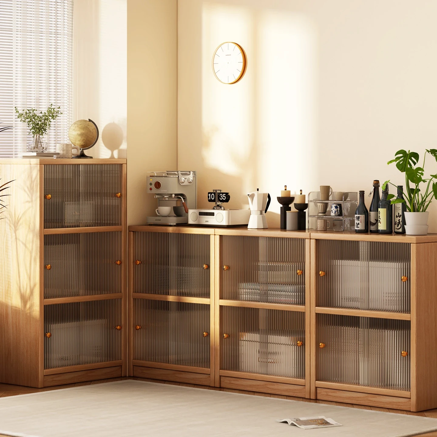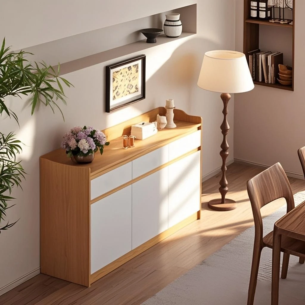 壁に寄せられる一体型収納キャビネット - 大容量で整理整頓が簡単!リビングに最適なローストレージキャビネット、ティーセットや小物をスッキリ収納。おしゃれなデザインで、空間をお洒落に演出します!