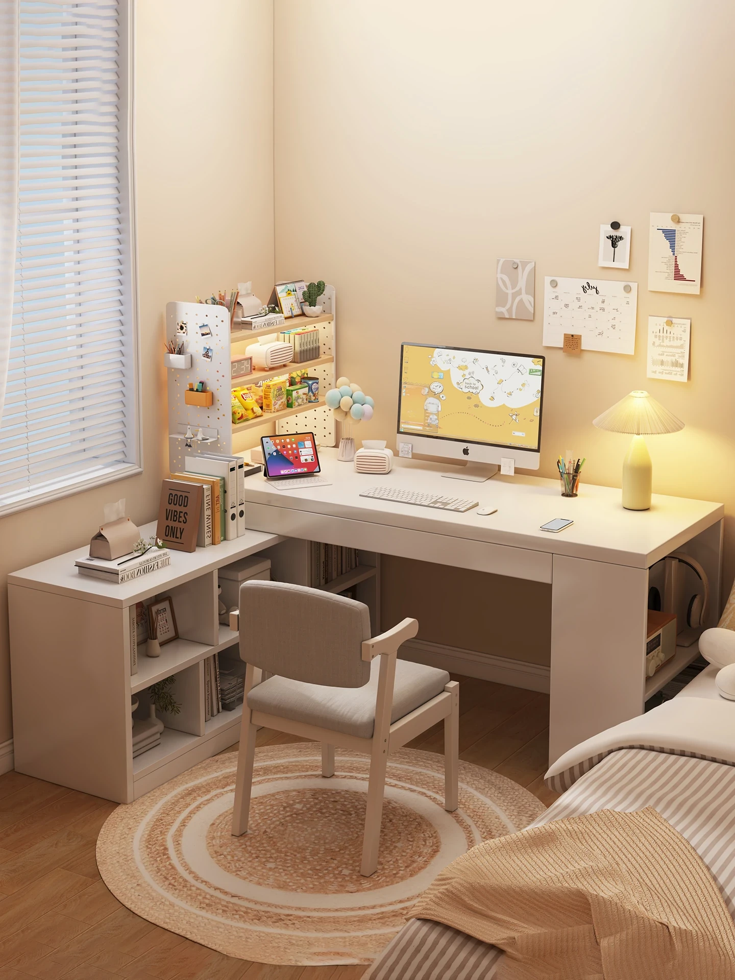 角度を活かしたおしゃれな書斎デスク!家用・寝室にぴったりな女性向けのコスメ台&書棚一体型L字型パソコンデスク。伸縮可能でスペースを有効活用!作業もおしゃれに楽しめます。