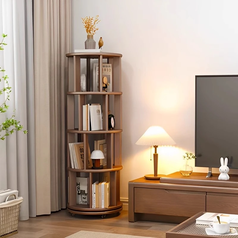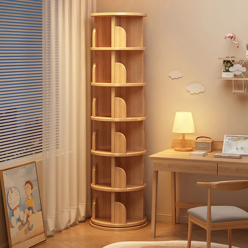 360度回転する無垢材製書棚 - 学生の収納にも最適!リビングや寝室にぴったりなフロアスタンドのコーナーシェルフ。美しいデザインでスペースを有効活用し、スタイリッシュなインテリアを演出します。