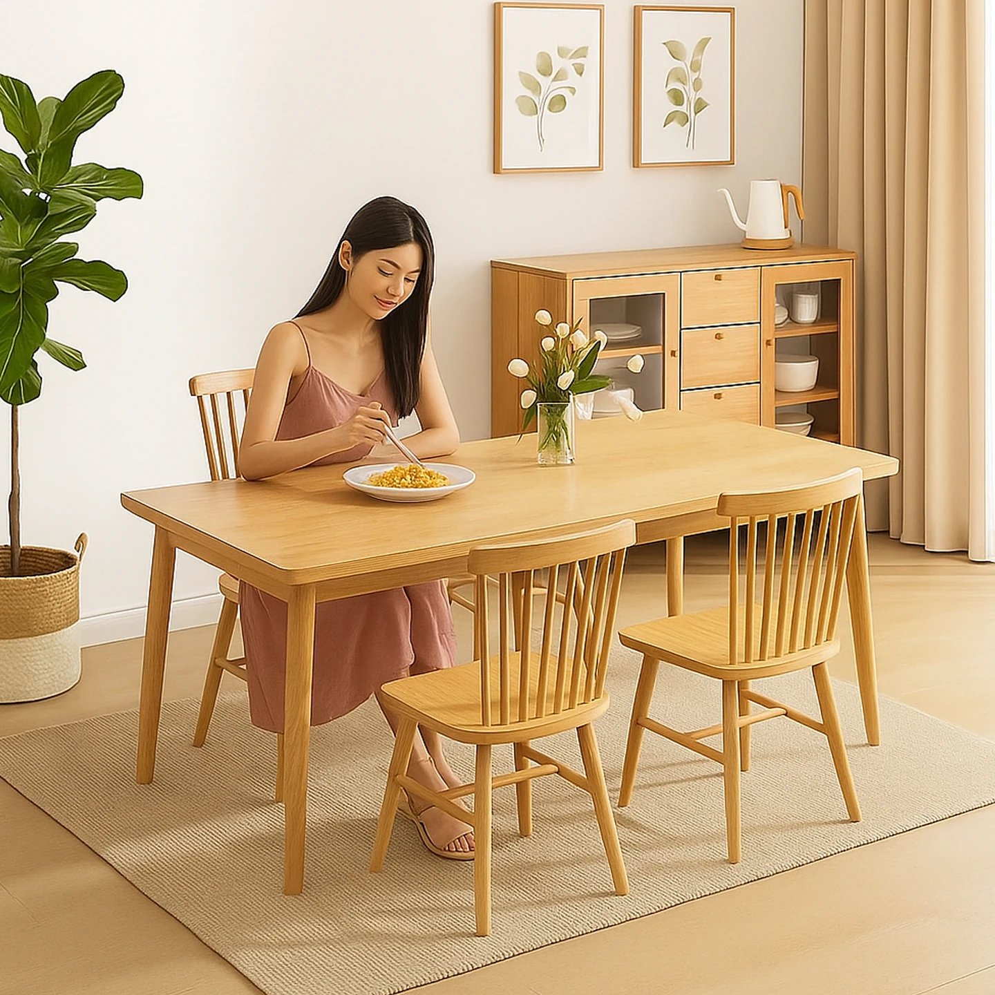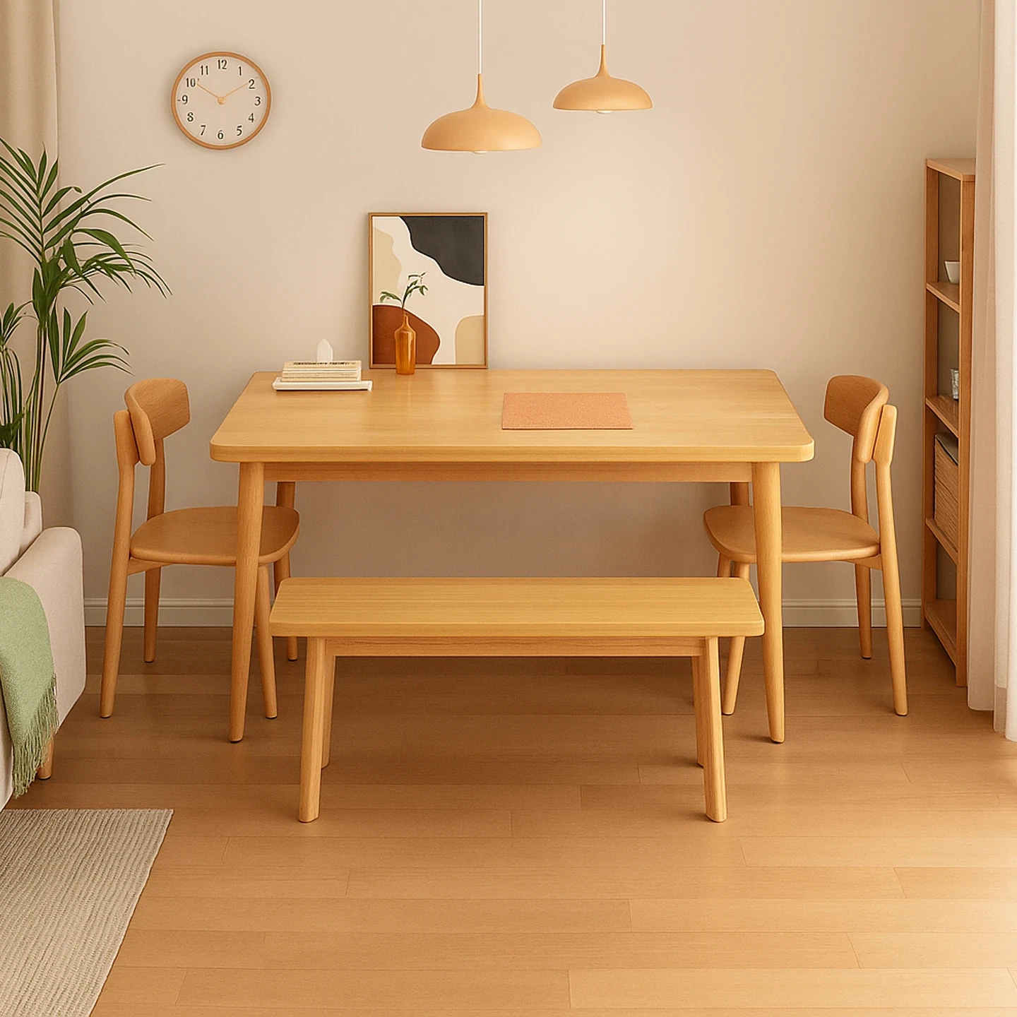 ナチュラルウッド風モダンミニマリストダイニングテーブル - 北欧スタイルの小型食堂にぴったり!使いやすい大判ロングテーブルとチェアのセットで、心地よい食事空間を演出します。